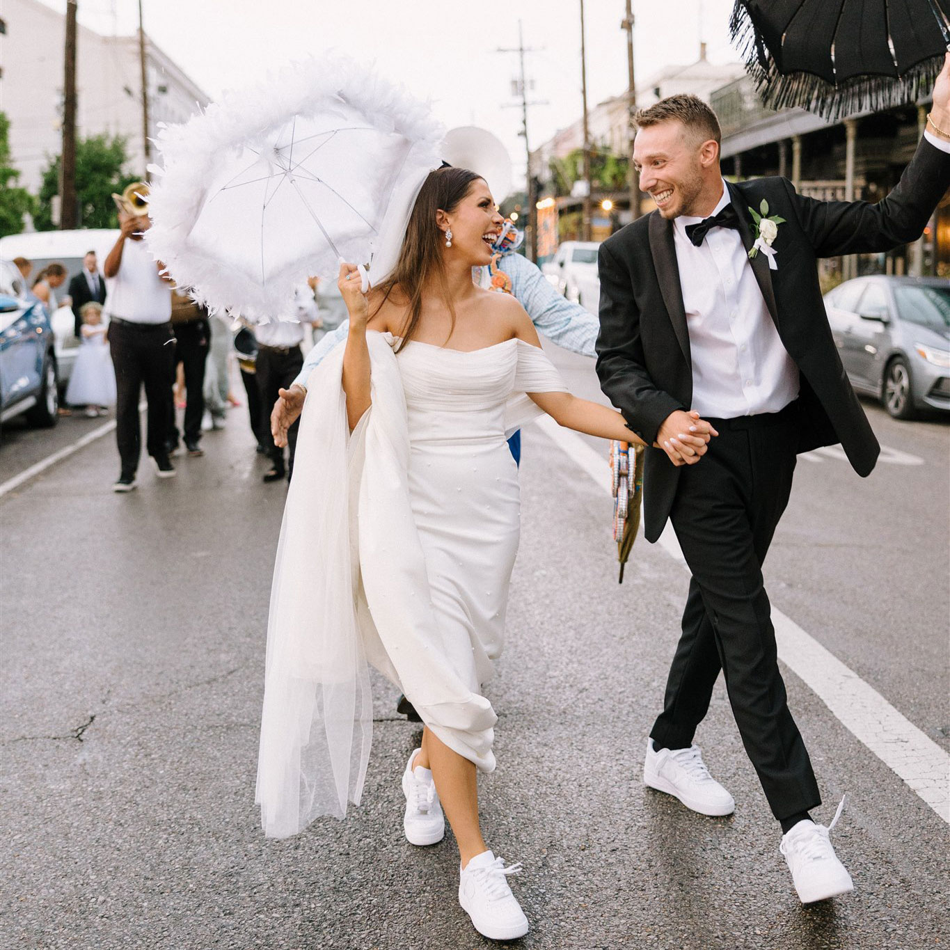Comfortable Footwear: Encourage guests to wear comfortable shoes. Dancing down the streets can be demanding (especially in New Orleans), and comfortable footwear will help everyone enjoy the parade to the fullest. Brides, this goes for you too! Bring a pair of shoes to change into before the Second Line.